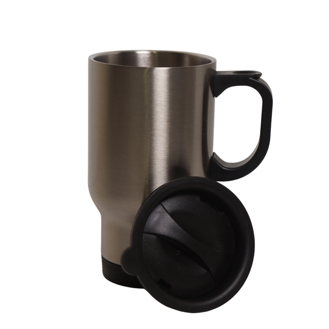 Taza viajera de acero inoxidable con capacidad para 14oz, disponible en color plata ideal para colocar increíbles diseños.